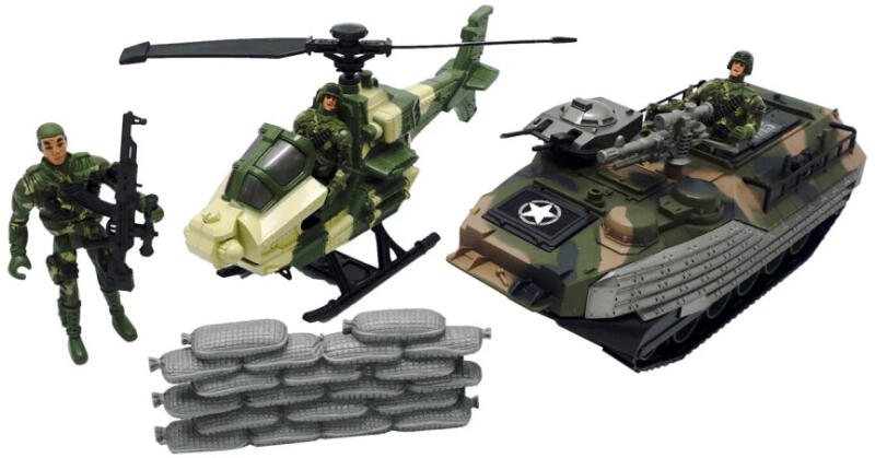 Ezzel a játékszettel bármilyen katonai harc elképzelhető és lejátszható. A műanyag katonai szettben figurákat és járműveket egyaránt megtalálsz. A készlet tartalma: - 3 db katona - 1 db tank - 1 db helikopter - 1 db katonai fedezék - fegyverek 3 éves kortól ajánljuk