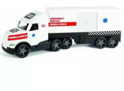 Wader: Magic Truck Action - mentő kamion gyerekeknek. A pótkocsi elforgatható és lekapcsolható, a kamion tolóajtaja nyitható. Magas minőségű anyagokból készült. Csomagolás mérete: 79 x 28 x 19,5 cm