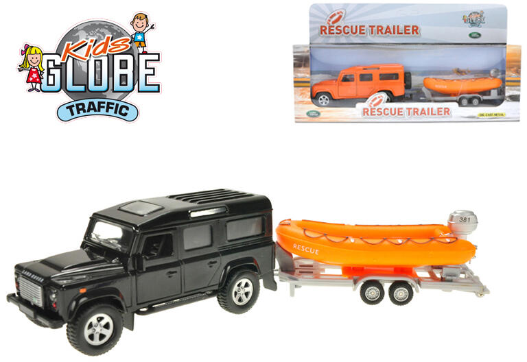 MIKRO TRADING - Kids Globe Traffic autó Land Rover Defender 14cm fém hátrameneti autó 11cm-es hajóval, rákban