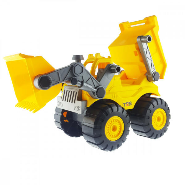 Masszív többfunkciós munkagép platóval és markolókanállal. Segíts be az építkezésen. Markold fel a munkagéppel a sódert, homokot, vasat, ezután pedig öntsd bele a hátul lévő platóba. A munka végén pedig öntsd ki a platóból az oda rakott anyagokat. A termék műanyagból készült.
