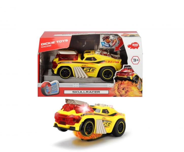 A Dickie Skullracer Dragster játékautó (3765001) minden gyorsulási versenyt meg fog nyerni! Ez a különleges és igazán vagány külsejű gyorsasági versenyautó motorizált funkcióval rendelkezik. A hátsó részén lévő gomb kétféle állásba tekerhető. RACE állásban a megnyomásakor a járgány felpörgeti motorját, majd kilő, mint egy igazi versenyen, eközben hallhatjuk a já