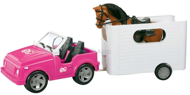 Vidd el a lovat egy kellemes ügetésre lószállító autóval!! A Horse Show terepjáró lóval és utánfutóval készletben egy rózsaszín terepjárót, egy fehér utánfutót és egy barna paripát találsz, amiket együtt tudsz használni bármilyen, 29-30 cm-es játékbabával. A babát be tudod ültetni a terepjáró üléseibe, biztonsági övvel rögzítheted őket, de még a ló nyerg
