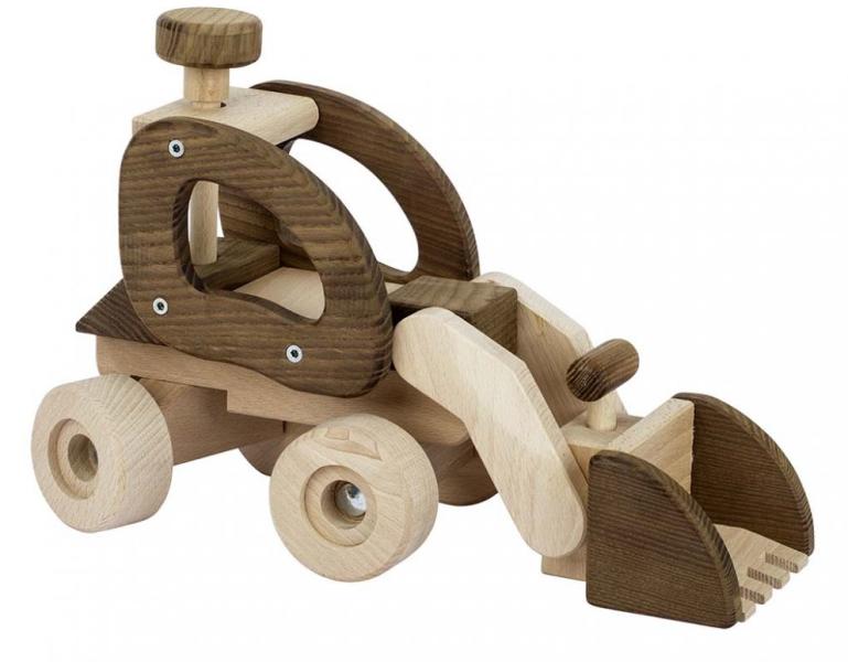 Masszív, igényesen kidolgozott fa játék munkagép, bulldózer emelhető tolólapáttal és kormányozható kerekekkel. Anyaga: fa Méret: 28 x 12,5 x 19 cm