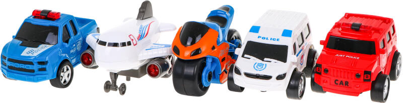 A járműkészlet garantáltan tetszeni fog az autók és közlekedési eszközök minden kis szerelmese számára. A készlet 5 különböző járművet tartalmaz. Az autók tökéletesen reprodukálódnak intenzív színekben. Az autók nem igényelnek akkumulátort, előre vagy hátra húzással működnek. Ezenkívül a csomagolás a járművek parkolójaként is használható. A kisautók ké