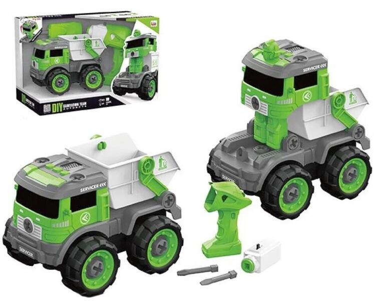 Csavarozható szemeteskocsi távirányításra. Az autó a mellékelt csavarhúzóval vagy fúróval összecsavarozható. Lehetőség van egy motor eltávolítására a fúróból, amelyet behelyeznek az autóba, majd a vezérlő segítségével előre-hátra hajt. Az autó robottá is alakítható. Az autó hangokat és fényeket is ad