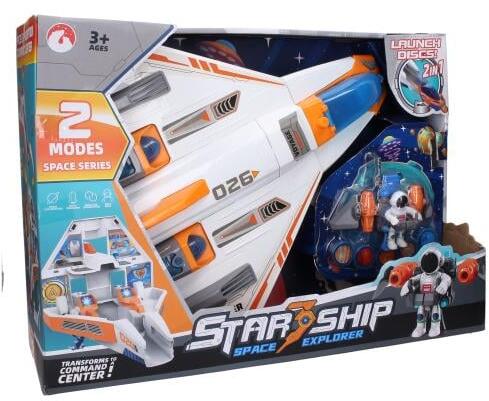 Űrsikló űrhajóssal és effektekkel. Méret űrsikló 55 cm, mentőmodul 19 cm, űrhajós 8 cm. Tartalom űrsikló, leválasztható elülső rész mint mentőmodul, lebegő jármű, űrhajós. A mentőmodul lemezeket lő ki az narancssárga gomb megnyomásával. Fény- és hanghatások a jobb motoron lévő gombbal és az űrsikló bezárásakor. 3xAAA elemek az szárny alján találhatók. Ké
