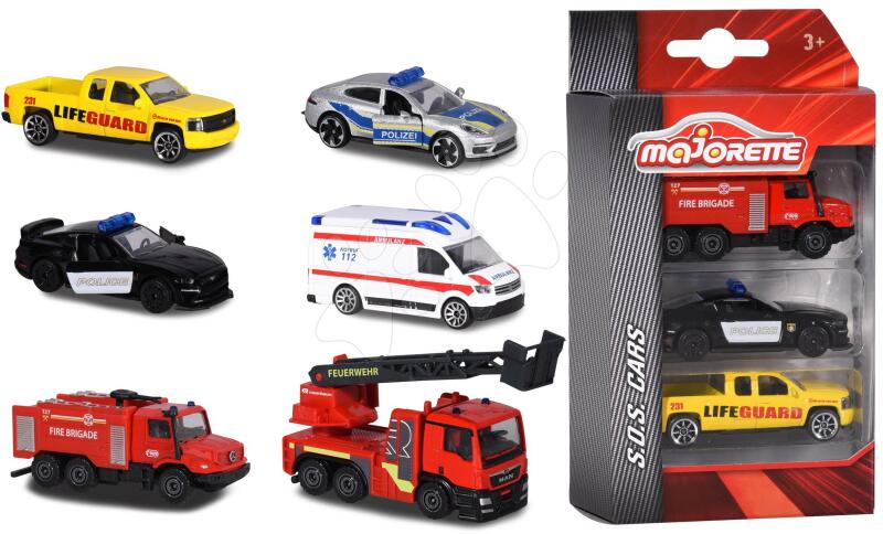 S. O. S. készenléti kocsik a francia Majorette gyártótól gyerekeknek 3 éves kortól. A licenszelt modellek valósághű élmenyekkel töltik el a gyerkőcöket a rendőrös, tűzoltós és mentős szerepjátékok során. Részletgazdag kidolgozásukkal a gyűjtőket is megnyerik. Játékboltunk 3-részes készletet kínál, 3 különböző modellel. A feltüntetett ár 1 készletre vonatkozi