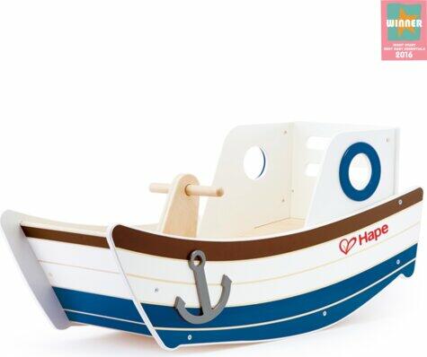 Hape - Barcuta fa hinta Üljön be a vontatóhajóba, és ringatózzon az óceán képzeletbeli hullámain! Menj át a mélykéken, és ringasd fel ezen a vontatóhajón. Ülj le a csónak fedélzetére, fogd meg a kilincseket, és forogj előre-hátra, mintha az óceán hullámain lennél. Képzeld el, hogy kalandban vagy a tengeren! A játékok fából készülnek, környezetbarát anyagok felha