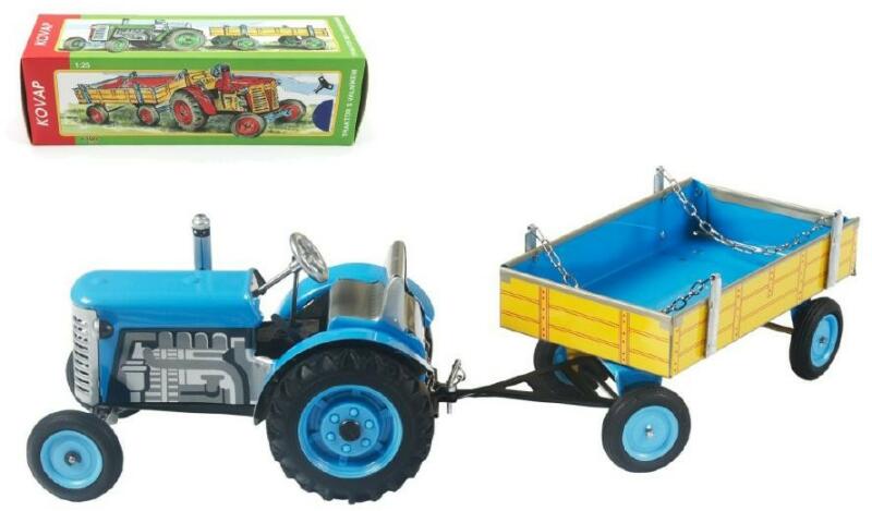 Kék Zetor traktor sárga Kovap platós, kulccsal visszahúzható. Csomagolás: doboz Mérete: 28 cm Anyaga: fém