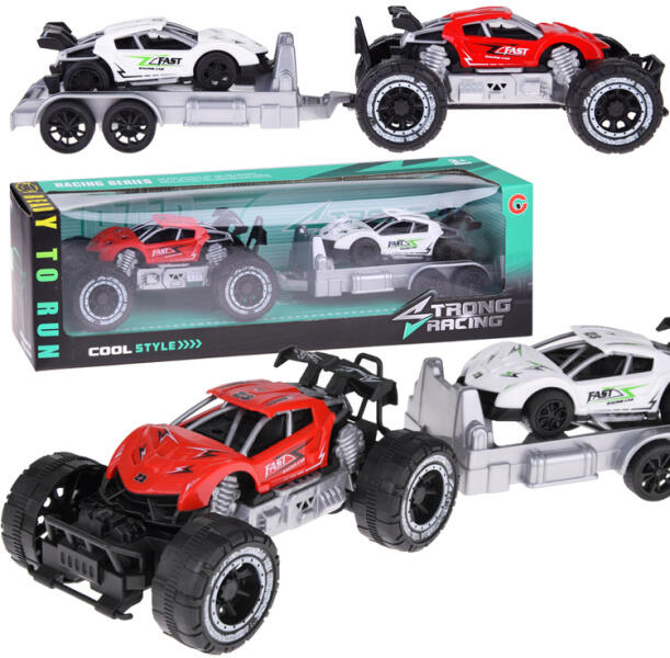 Csodálatos terepjáró vontatóval, aminek nem lesz akadálya. Az autók és a pótkocsi teljes egészében műanyagból készültek. A vontató és a sportautó kerekei gumi, a terepjáró kerekei műanyagok. A SUV előregyorsulással mozog, a sportautó pedig húzómechanizmussal mozog – húzza vissza és engedje el. Az utánfutó sportkocsit szállító vontatóként szolgál, ideális rally