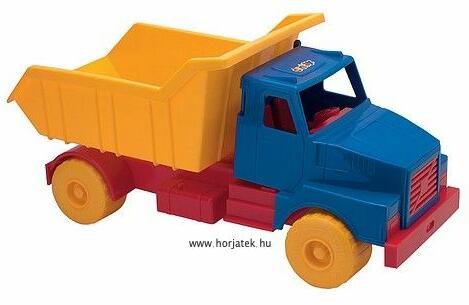 Ennek a teherautónak stabil, strapabíró kerekei vannak, ezért a homokozóban is bátran használható. Homokvárat építésénél jó segítség lesz. Mint egy igazi dömpernél, a hátulja ennek is billenthető, így a terhet könnyen ki lehet belőle önteni. Tartós, erős műanyagból készült, óvodák számára fejlesztették ki, teherbírását tesztelték, így az otthoni használatb
