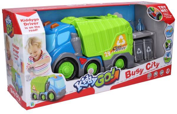 Kiddy Auto Garbage Dump effektekkel. A csomag tartalmaz egy szemeteskocsit 31 cm-es hatásokkal, 2 szemeteskukát, 2 szemeteszsákot. Fény és hanghatások. Az effektusok az autó oldalán található gomb megnyomásával aktiválhatók. Az autó tolóajtóval rendelkezik. A kukák kinyithatók. Szabad kerekek. 2xAA elem mellékelve.