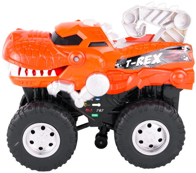 Félelmetes nagy kerekű autó, ami egy dínót formáz! A Dinoszaurusz elemes autó egy narancssárga műanyag karosszériával készült terepjáró, ami a hátsó két kerekére tud ágaskodni. Az autó menet közben ijesztő hangokat ad ki magából, a szélvédője kísérteties vörös fénnyel világít, gombnyomásra a járgány zenélni kezd, félelmetesen morog, miközben a száját is k