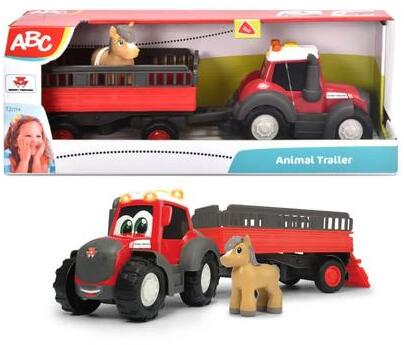 A Dickie ABC Massey Ferguson állatszállító traktor lóval a kisebb korosztály egyik kedvenc járműve! A kedves, mosolygós arcú traktor most épp a lovacskát szállítja haza az istállóba, de szalmabálákat is felpakolhat rá a gazda. A fülke tetején lévő gombot nyomva hang- és fényeffekt ek teszik még izgalmasabbá, vidámabbá a munkálatokat. Az utánfutó hátsó ajtajai leny