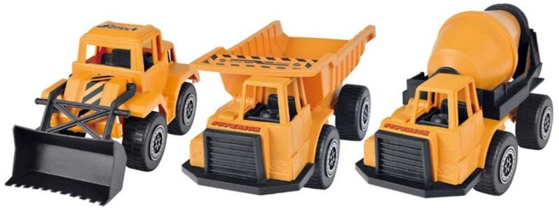 A Műanyag munkagép készletben egy tologatható, mozgatható munkagépet találsz, ami a homokozóban is jó szolgálatot tehet. A markolós traktor kanala mozgatható, a dömper platóját is fel tudod emelni, és a betonkeverőnek is forgatható, emelhető a tartálya. A műanyag munkagép narancssárga-fekete színösszeállításban készült. Méretek: 27 x 13 x 13 cm. > 3 éves kortól