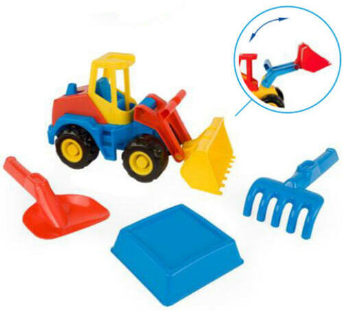 Egy homokozó szett akkor teljes, ha munkagép is tartozik hozzá, elvégre a homokot szállítani kell. A készletben található egy lapát, egy homokozó forma, egy gereblye és egy élénk színű, kiváló minőségű műanyagból készült munkagép. A 27 cm hosszú homlokrakodó buldózerként és rakodóként egyaránt használható, de akár el is simíthatja a terepet. A munkagépek megi