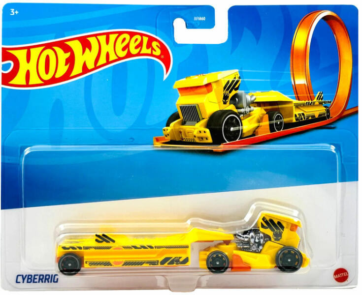 Sárga színű Hot Wheels Track Stars Cyberrig kamion utánfutóval. A kamion fém és műanyag felhasználásával készült, és bármelyik Hot Wheels City pályával, kisautóval együtt használható. Csomagolási méretek: 20 x 4 x 16 cm.
