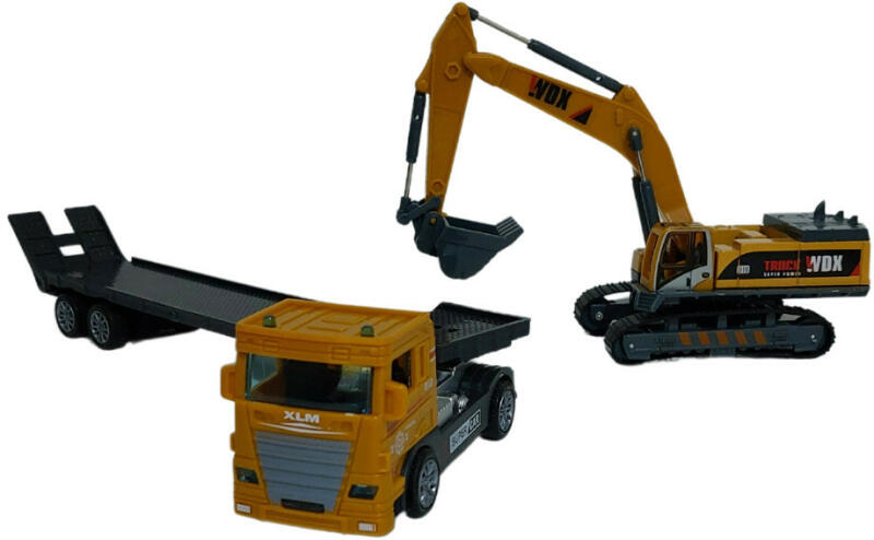 Munkagépet szállító kamion. Az elemei mozgathatóak. Méretei: 30x 5x 8,5 cm.