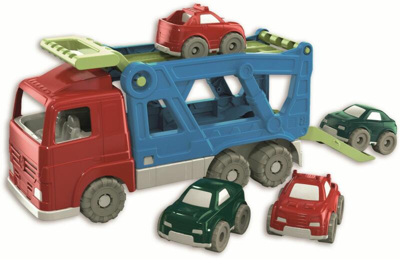 Autószállító 4 autóval és rámpákkal, kiváló minőségű újrahasznosított műanyagból Olaszországban. Barna ökodobozba csomagolva. Csomag méretei: 49 x 18,5 x 21,5 cm (HxSzxM). Súly: 0,6 kg. Ajánlott életkor 3 éves kortól