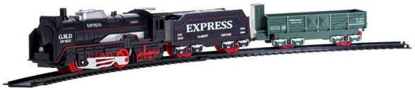 Vasúti készlet. A vasút méretei 68x68 cm, a mozdony mérete 13 cm, a kocsik 9-11 cm. Tartalmaz egy mozdonyt és 2 kocsit. Fényhatások. 2xAA elem nem tartozék. ON/OFF kapcsoló a mozdony jobb oldalán.
