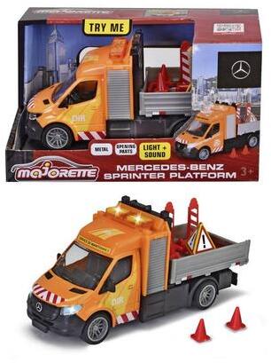 Majorette Mercedes Benz Sprinter platós kisteherautó (15 cm) - játékautó billenő platformmal, fény, hang és közlekedési táblákkal. A szemet gyönyörködtető sprinter (15x5,5x7 cm) sok-sok mókát hoz a gyerekszobába. A kis építőmunkások az autó tetejét megnyomva aktiválják a megfelelő építkezési hangokat és lámpákat, például az első fényszórókat és a tetőn lé