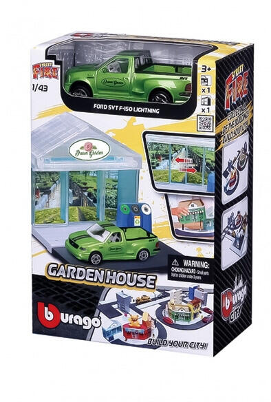 Garden House játékkészlet a StreetFire sorozatból, 1:43-as méretarányú játékautókkal, 3 éves kortól alkalmasMindig is saját várost akartál építeni? Nos, ez most lehetséges a Bburago StreetFire sorozat városi játékkészleteivel. A kerti házkészlet, a mozgatható ajtós műanyag épületen kívül utcai és járdaelemet, valamint különféle kiegészítőket tartalmaz. És a