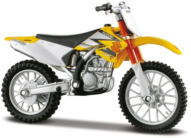 Suzuki RM-Z250 motorkerékpár modellje 1:18 méretarányban, műanyag és fém alkatrészekből. Főbb jellemzők és specifikációk: Átlátszó fóliával ellátott kartondobozba csomagolva Forgatható kormány Felfüggesztett hátsó villa A csomag méretei: 16x10,5x7cm 3+ korosztály számára készült