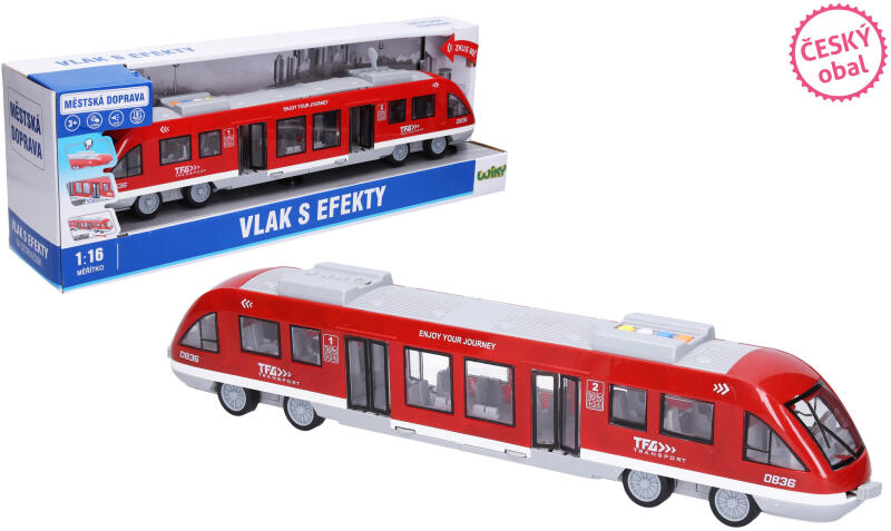 Vonat hatásokkal. Mérete 44,5 x 5,8 x 9 cm. Fény- és hangeffektusok, aktiválás gombokkal a tetőn. A lendkeréken.