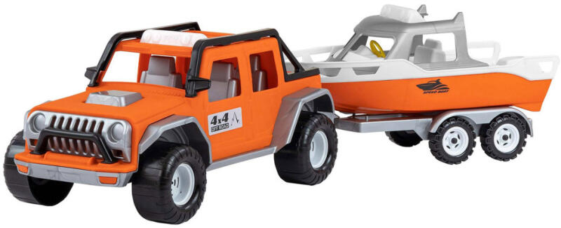 Két önálló játékból álló készlet. A modern színekben pompázó terepjáró egy pótkocsin húzza a motorcsónakot. Lehetőség van a játékra egy zsinórt rögzíteni, ezáltal lehetővé teszi, hogy a gyermek maga mögött húzza a játékot. Tulajdonságok: Utánfutós terepjáró motorcsónakkal - anyaga: minőségi műanyag - képzelőerőt fejlesztő játék A termék színei elt