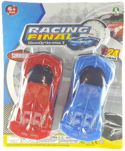 Két szuper gyors autó egy csomagban. Egy kék és egy piros autó a nagy versenyekre. Autók mérete: 18 cm. 3 éves kortól ajánljuk.