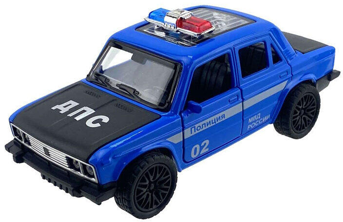 1:32-es méretarányú fém kisautó nyitható ajtókkal és csomagtartóval, rendőrségi festéssel. Az autó lámpái világítanak, és hangot is ad. A hátrahúzható motoros Lada 2106 kisautó mérete 12 cm.