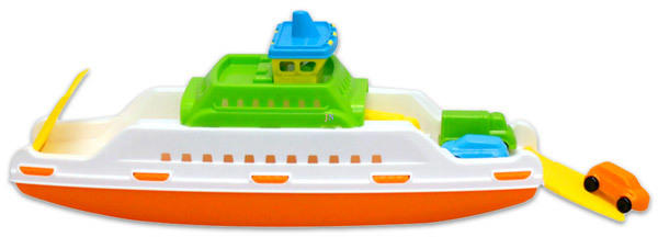 Mit kell tudni a játékról? Autószállító hajó 4 db kisautóvalMűanyag autószállító hajó, mellyel a gyerekek a vízben szállíthatják a készletben található 4 színes kisautót. De akár az otthoni kisebb méretű kocsikat is beletehetik. A játékkomp 39 cm, erős műanyagból készült. Az elején és végén található hidakat fel-le hajthatják a gyerekek, így a kocsik könn