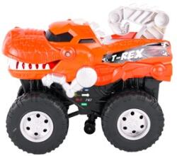 Félelmetes nagy kerekű autó, ami egy dínót formáz! A Dinoszaurusz elemes autó egy narancssárga műanyag karosszériával készült terepjáró, ami a hátsó két kerekére tud ágaskodni. Az autó menet közben ijesztő hangokat ad ki magából, a szélvédője kísérteties vörös fénnyel világít, gombnyomásra a járgány zenélni kezd, félelmetesen morog, miközben a száját is k