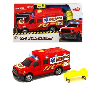 A Dickie SOS Series City Ambulance játék mentőautó (3713013) gombnyomásra szirénázik és a megkülönböztető jelzés villog a tetején. Ezt látva minden autós félreáll az útjából. A mentőautó hátsó ajtaja nyitható, ahol a betegeket, sérülteket a hordággyal együtt be lehet tenni a kocsiba és már indulhat is a szirénázó mentő a kórházba. A Dickie City Ambulance ment