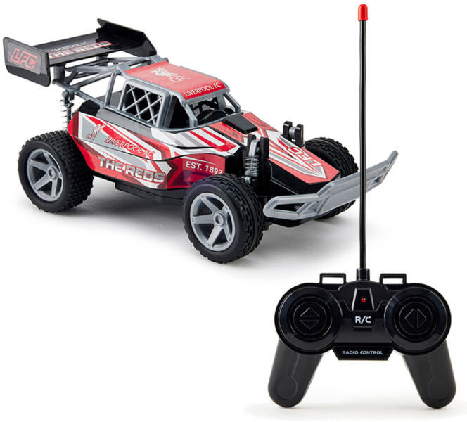 Liverpool távirányítós buggy Kiegészítve a Liverpool FC márkajelzéssel, beleértve a „The Reds feliratot mindkét oldalon. Gumi kerekekkel és egy áramvonalas légterelővel a hátoldalon a nagyobb sebesség érdekében Működő rugós felfüggesztés, állítható első kerékbeállítás és xenon stílusú LED fényszórók 1:18 méretarányú rádióvezérlésű autó négyirányú