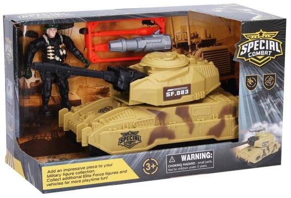 Tank figurával. Méret: 25 cm. Mo movable torony, forgatható kabin, lövő géppuska. Korosztály: 3+ Tartalmazza tank, figurát, 2 töltényt a géppuskához