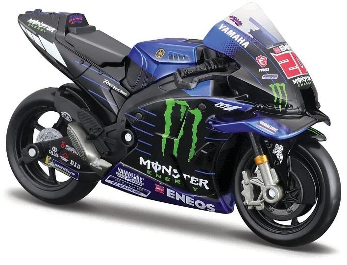 1:18 méretarányú motorkerékpár modell. Főbb jellemzők és specifikációk: Átlátszó fóliával ellátott kartondobozba csomagolva Forgatható kormánykerék Felfüggesztett hátsó villa Véletlenszerű választás #12 Maverick Viňales és a #20 Fabio Quartararo között Csomag mérete: 17,1x10,5x7cm. 3+ korosztály számára készült