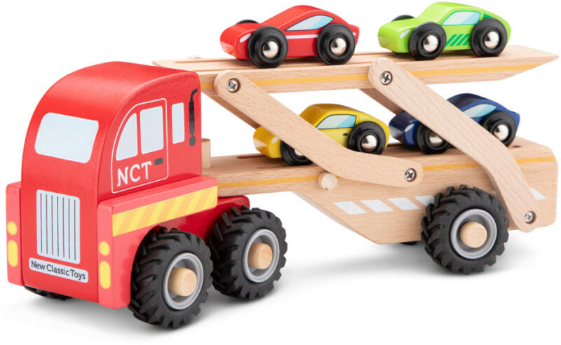Ez a játék autószállító kamion stabil bükkfából készült. A felső szint lefelé és felfelé is emelhető, a pótkocsi pedig leválasztható a teherautóról. A játék négy kisautót tartalmaz. Méret: 275 x 85 x 110 mm
