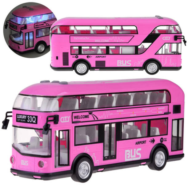 Vidám rózsaszín emeletes busz minden bizonnyal sok fiatal sofőr és e járművek rajongó figyelmét felkelti majd. Ez a valósághű emeletes busz nagy precizitással, kellemes rózsaszín színben készült, és teljes egészében műanyagból készült. A hang- és fényeffektusoknak köszönhetően a busz remek szórakozást garantál. A busz nyitható ajtókkal rendelkezik, az üvegablako