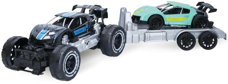 Traktor autóval. Méretei 45x12,5x9,5 cm. Mindkét lendkerekes autó. Szín - a nagyobb autó fekete, a kisebb zöld. 3+ életkor