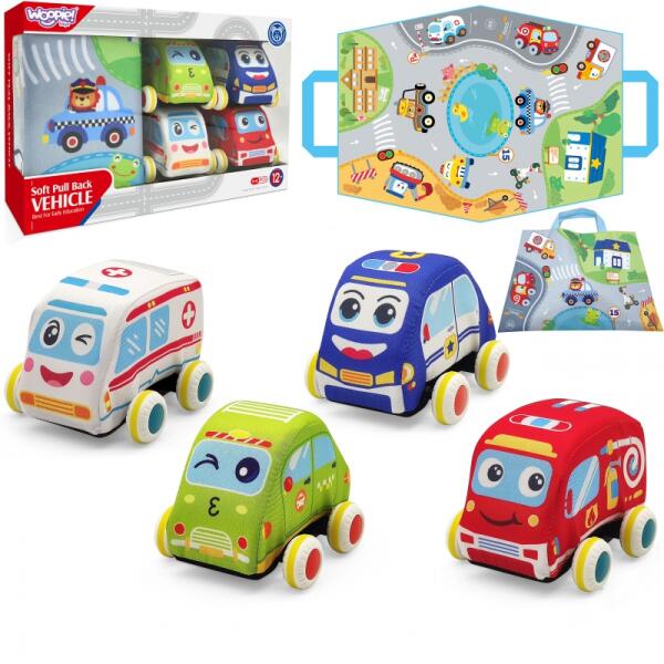 A WOOPIE plüss játékautó szett utazószőnyeggel nagyszerű játék lesz gyermeke számára. A gyermek a szőnyegen ülve irányíthatja az autókat. Meg tudja szorítani a kocsit, mert az tele van vattával. Amikor visszahúzza az autót, és elenged, az autó kilő az útra. A kocsik gumikerekekkel és gumiborítással rendelkeznek. Játék után a gyermek félbehajthatja a szőnyeget, és