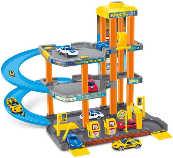 Parkolóállomás 3 fém autóval és egy helikopterrel. Dimenziók: 30x27x37 cm. Autó mérete: 7 cm. Az állomás 3 fém autót, 1 fém helikoptert, kézi liftet, helikopterleszállót, benzinkutat és sorompót tartalmaz. A kar elmozdításával a parkolóhelyen - az autó felszabadítása a parkolóhelyről. Kor: 3+