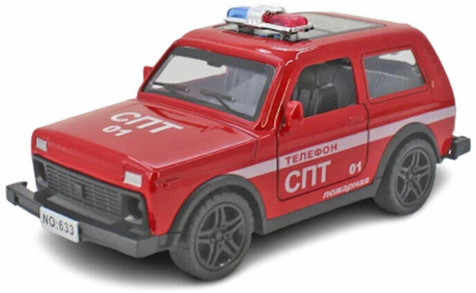 1:32-es méretarányú fém kisautó nyitható ajtókkal és csomagtartóval, tűzoltósági festéssel. Az autó lámpái világítanak, és hangot is ad. A hátrahúzható motoros kisautó 12 cm-es.