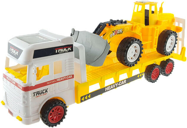 Kamion, amely munkagépet szállít. Az első kereke lendkerekes. Csomagolás: 315x125x75 Méret: 31.5 cm Anyaga: műanyag