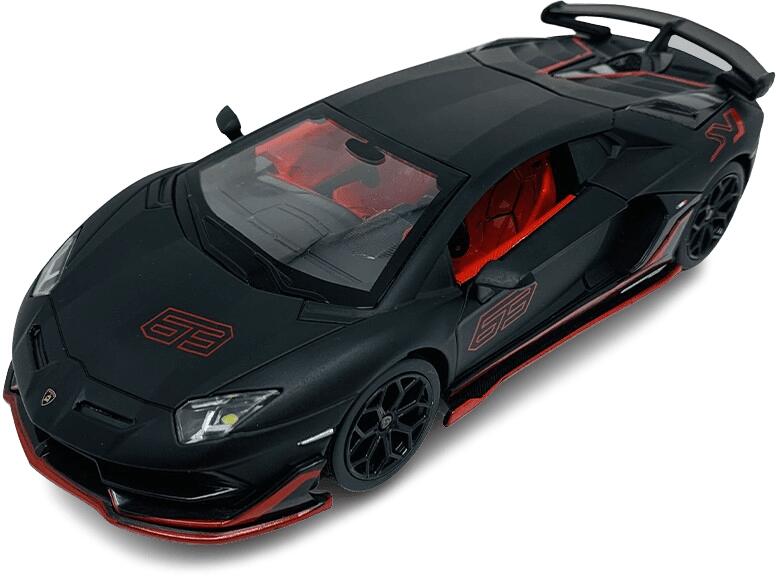 1:24 Lamborghini Aventador SVJ A játékautó kiváló minőségű fémből készült és műanyag elemekkel rendelkezik. Valósághű hang- és fényeffektusokkal rendelkezik. Elemek - 3x AG13 (a csomag tartalmazza) 3+ életkor