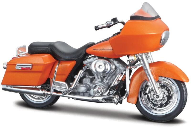 2002 FLTR Road Glide fém modellje 1:18 méretarányban. Főbb jellemzők és specifikációk: Forgatható kormány Felfüggesztett hátsó tengely Talapzatra szerelve Csomagolási méretek - 17,8x10,6x6,35cm 3+ éves korosztály számára készült