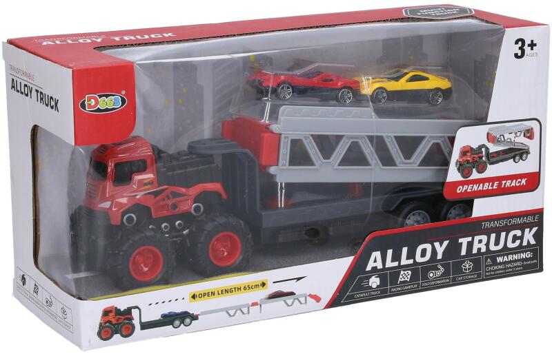 Fém vontatókocsi játékautókkal összecsukott traktor iparvágánnyal 28 cm, kibontva 65 cm, 2x játékautó 7 cm. 2 változat - piros, zöld. (nincs választás) Szabadonfutó játékautók, lendkerekes traktor. Az iparvágány elülső részén elsütőgomb található.