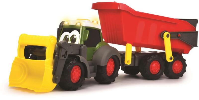Dickie ABC Happy Fendt traktor pótkocsival (204119000) - A kedves kis járgányhoz tartozik egy piros dönthető pótkocsi. Az elején található markoló kanál emelhető és könnyen lehet vele egy-egy rönköt vagy bármilyen nagy anyagot mozgatni. A traktor tetején található gombbal fények és hangok játéka teszi még élvezhetőbbé a munkát az erdőben. Lekerekített formáival és