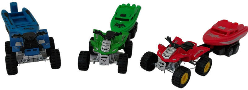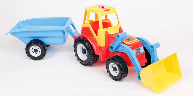 Traktor homlokrakodóval, amely képes a kanalát teljesen megrakott homokkal is felemelni. A színes műanyag traktor hátuljára erősített kétkerekű pótkocsival van felszerelve. A kétkerekű tengelynek köszönhetően az utánfutó leválasztáskor könnyen hátradől, és lehetővé teszi annak tartalmának a kiöntését. Traktor rakodóval és pótkocsival (091) Tulajdonságok: - hossza