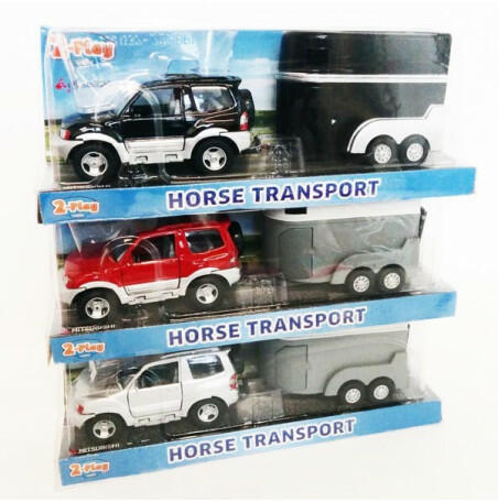 A Mitsubishi lószállító utánfutóval egy olyan játékautó fémből és műanyagból, amely hátrahúzós kivitelben, nyitható ajtókkal, modell szerű kidolgozással, több színben készült. Mérete: 24,5 cm. Választható színek: Fekete, Szürkés-Kék, Piros, zöldAjánlott 3 éves kor felett. Kérlek jelöld a megjegyzés rovatban, hogy milyen színt szeretnél, ha nem teszed, akkor